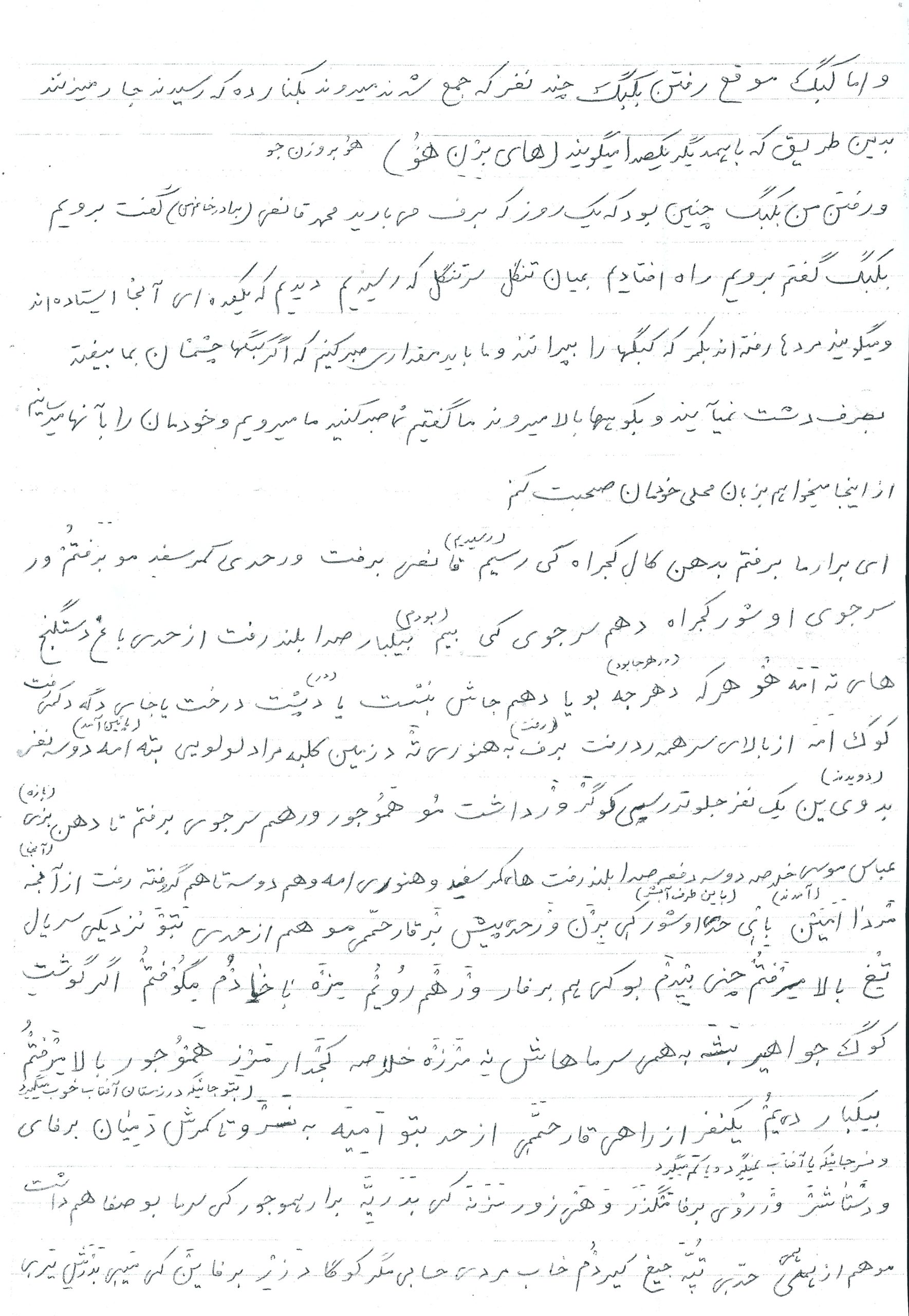 های تَه اَمَه هُو. هر کِه دهر جِه بو یا دِهَم جاش بنشست یا دپشت درخت یا جای دگه دِ کمی رفت . کوک اَمه از بالای سر همه رد رفت . بِرَف به هنوری تَه دِ زمین کِلبِه مراد لولویی بتَه اَمَه دو سه نفر بدوی ین یک نفر جلو تر رسی کوگر ورداشت مُو همُوجور ور هم سر جوی برفتم تا دهن بزی ( بازه )عباس موسی . خلاصه دو سه دفعه صدا بلند رفت : های کمر سفِد و هنوری امه و هم دو سه تا هم گروفته رفت از آنجه مردا اَمَیَن بِای حد اوشور کی بِرن ورحدی پیش بَر غار حممی . مو هم از حدی بتو نزدیکی سَر یال تِغ بالا مِرفتُم چنی بِیدَم بو کی هم برفار وِر هَم رویُم مِزَه . با خادُم مِگوفتُم اگر گوشتِ کوگ جواهیر بَشَه به همی سرماهاش نِه مَرزَه . خلاصه کَجدار مَرِز هموُجور بالا مِرفتُم بیکبار دی یُم یکنفر از راهی غار حممی از حدِ بتو اَمیه به نِسَر و تا کمرش دَمیان برفایَ و دستاشِر ور روی برفا مِگذرَ و هَی زور مزنه کی بِدَریَه . برار هموجور کی سرما بو صفا هُم داشت . مو هُم از همی حدی تُپه جیغ کیردُم خاب مردی حسابی مگر کوگا د زِر برفایَن کی مَیی بدَرِش یَری.