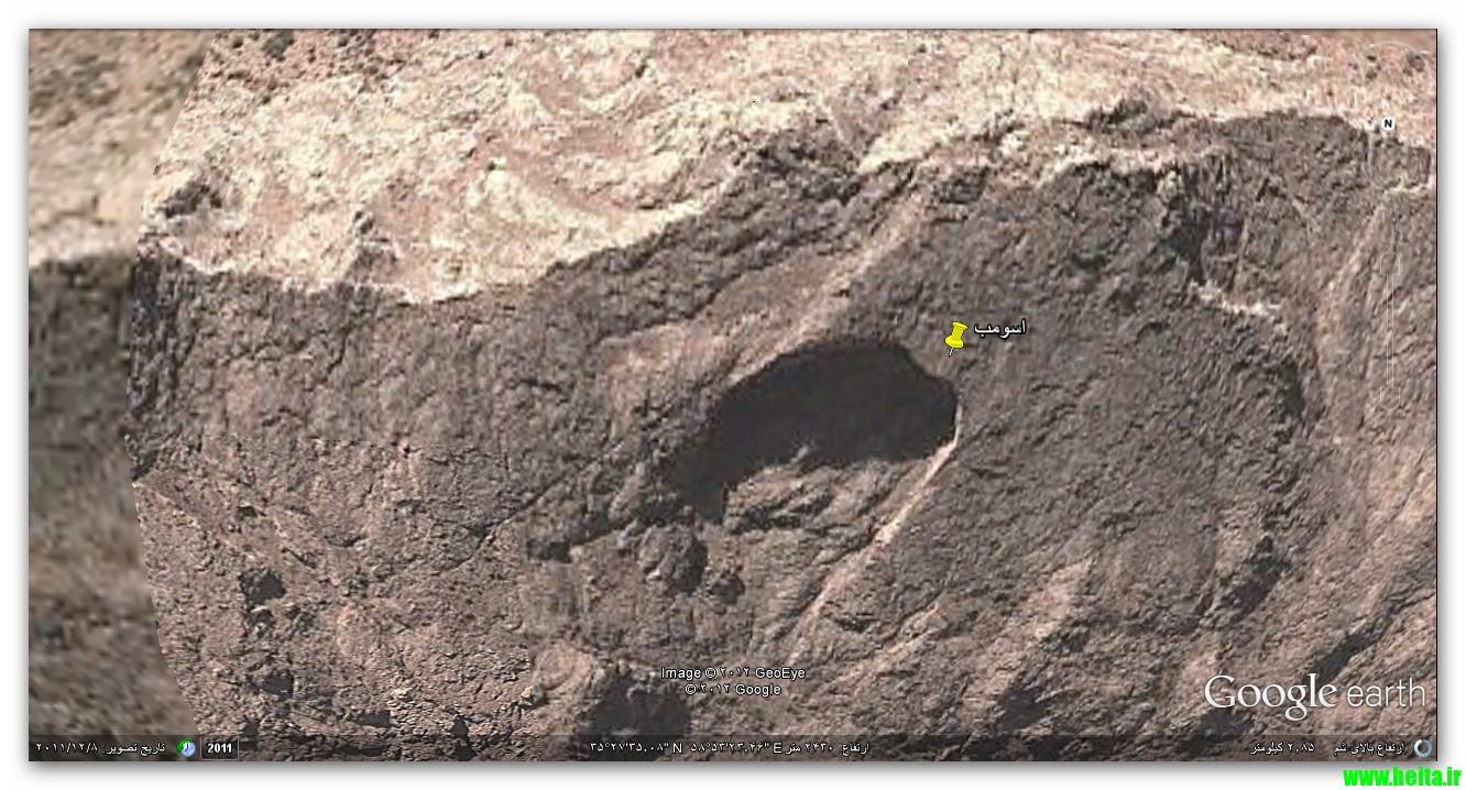 سلام بر حیتا نشینان گفته بودم که عکسی هوایی در مورد مکان طاق اسومب ارایه میکنم که محل دقیق آن را نشان میدهد .هر چند اطلاعات زیادی در این مورد ندارم ولی تا آنجایی که می دانم با توجه به حرف های آدمهای سن و سال دار رودمعجن که میگویند این رد پای اسب حضرت علی (ع)است!!!!!!!!!!!!!!!!!!!!!!!!